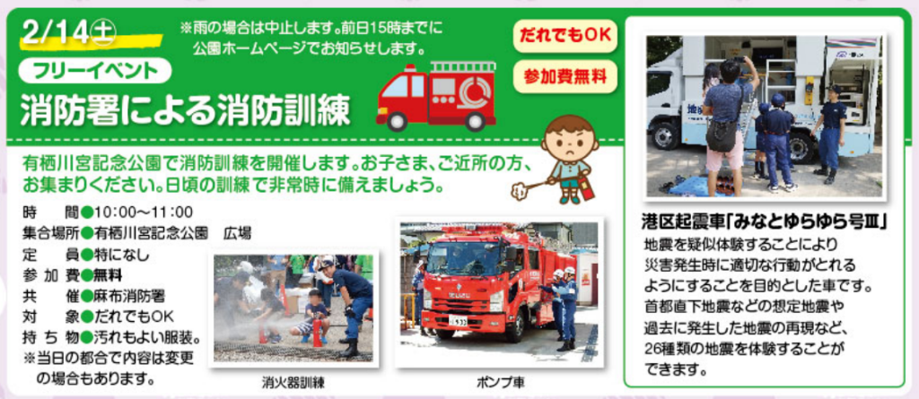 有栖川宮記念公園で消防訓練を開催します。お子さまから、大人の方まで誰でも参加できます。
